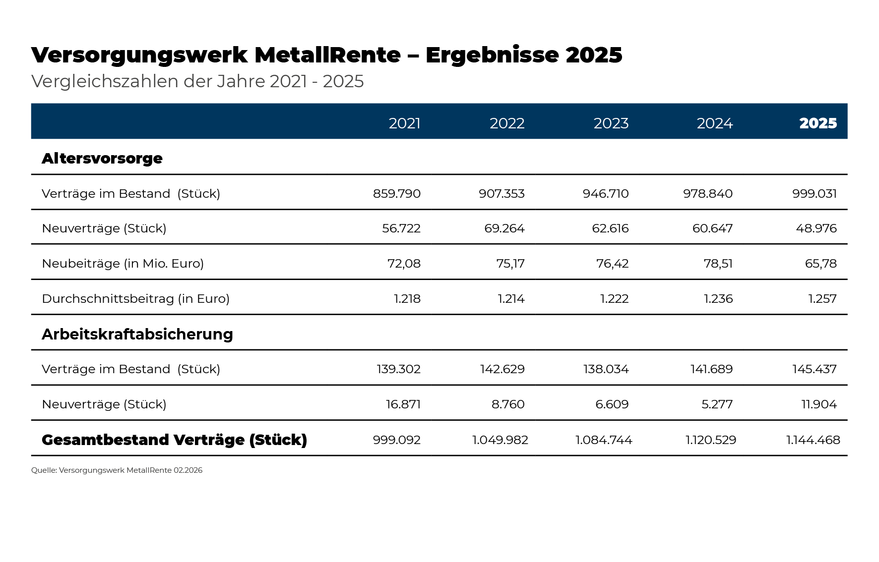 Berlin, 25. Februar 2026 – MetallRente blickt positiv auf 2025 zurück, als ein Jahr der Stabilität und des qualitativen Wachstums. Trotz wirtschaftlicher und politischer Herausforderungen hat sich Deutschlands größtes Branchenversorgungswerk als stabiler und verlässlicher Partner für die betriebliche Altersversorgung und Arbeitskraftabsicherung erwiesen und seine Marktposition in der Metall- und Elektroindustrie und vielen anderen Branchen weiter gefestigt. Zu Beginn des 25. Jubiläumsjahres 2026 verzeichnete die gemeinschaftliche Einrichtung der Sozialpartner Gesamtmetall und IG Metall einen Gesamtbestand von 1,14 Millionen Verträgen. „Gerade in einem von Unsicherheiten geprägten Umfeld zeigt sich die Stärke langfristig ausgerichteter, kollektiver Vorsorgelösungen“, sagt Hansjörg Müllerleile, Geschäftsführer, MetallRente.