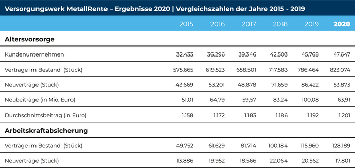 Rund 54.000 neue Verträge haben Beschäftigte im vergangenen Jahr für ihre betriebliche und private Vorsorge beim Versorgungswerk der Metall- und Elektroindustrie sowie weiterer Branchen abgeschlossen. Damit liegt das Wachstum der Neuverträge zwar rund 11 Prozent unter dem Durchschnitt der letzten fünf Geschäftsjahre, „angesichts der in allen Wirtschaftsbereichen gravierenden Einschnitte sind wir aber sehr zufrieden, in diesem Umfang weiter zu wachsen“, betont MetallRente Geschäftsführer Heribert Karch. Der Bestand der Verträge zur kapitalgedeckten Altersversorgung ist 2020 gegenüber dem Vorjahr um knapp 5 Prozent auf rund 823.000 angestiegen. Mit insgesamt gut 950.000 Versicherten ist MetallRente weiterhin das größte Branchenversorgungswerk Deutschlands. Auch die Zahl der Arbeitgeberkunden wuchs im letzten Jahr um 1.900 auf rund 48.000 Unternehmen.