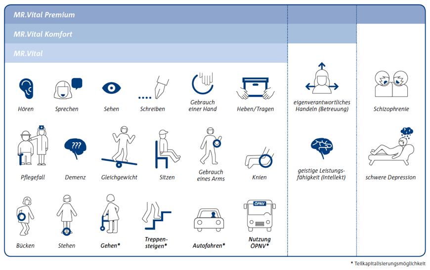 In der Basisvariante MR.Vital liegt der Fokus auf körperlichen Grundfähigkeiten. Schon bei Verlust einer Grundfähigkeit erhält man die versicherte Grundfähigkeitsrente, solange die Beeinträchtigung andauert oder im längsten Falle bis zum Ende der Leistungsdauer. In dieser Basisvariante werden im Antrag keine Fragen zur Psyche gestellt.