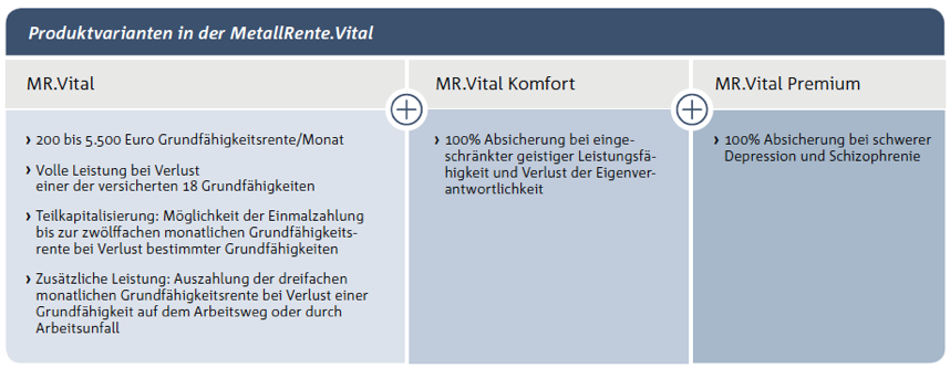 Rund 75% der der Arbeitnehmerinnen und Arbeitnehmer haben keine private Arbeitskraftabsicherung. Dabei ist jeder Vierte im Laufe des Berufslebens durch Krankheit oder Unfall von Erwerbsminderung betroffen. MetallRente hilft, diese Lücke durch bedarfsgerechte Vorsorgelösungen zu schließen. Deshalb bieten wir neben der MetallRente.BU und der MetallRente.EMI ab 1. Juli 2018 ein neues Produkt an, das vielen Beschäftigten den Einstieg in die Arbeitskraftabsicherung erleichtert: die Grundfähigkeitsversicherung MetallRente.Vital in ihren drei Ausprägungen MR.Vital, MR.Vital Komfort und MR.Vital Premium.