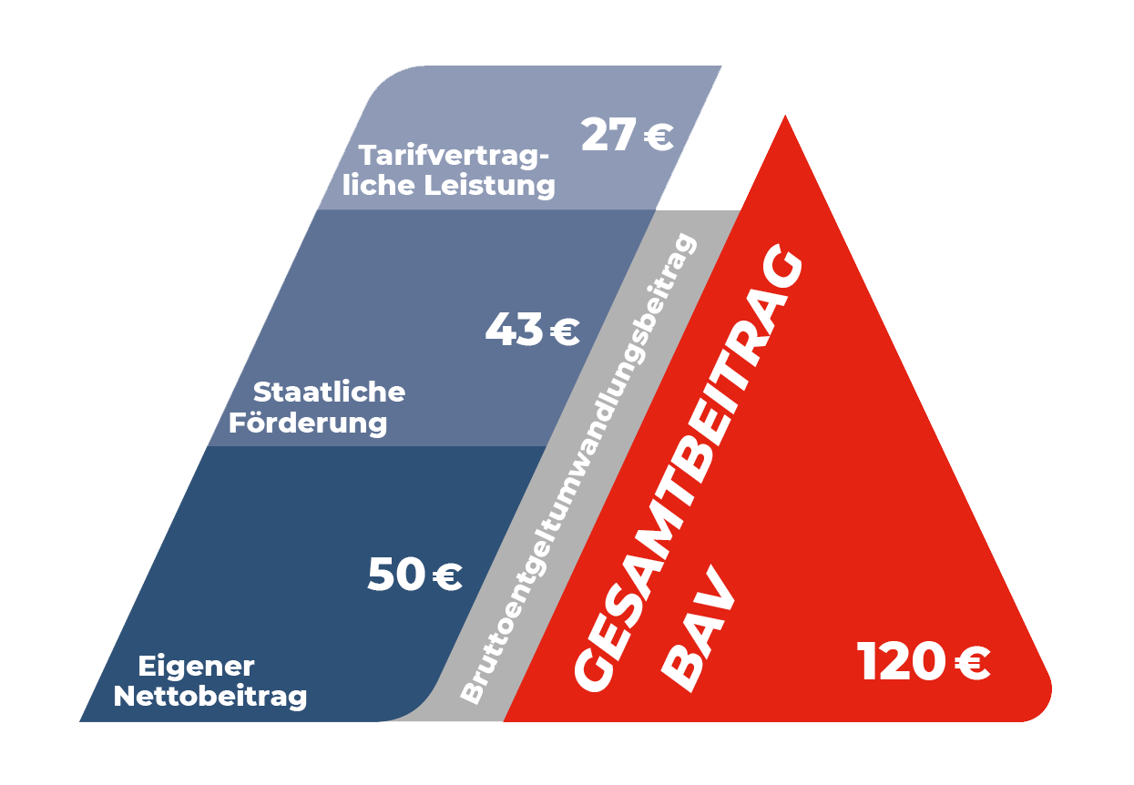 Angenommen eine Person verdient 40.000 Euro brutto im Jahr. Durch eine Betriebsrente sichert sie ihr Leben im Alter zusätzlich finanziell ab. Momentan kann sie dafür auf 50 Euro monatlich im Portemonnaie verzichten. Durch die Förderung vom Staat und die tarifvertragliche Leistung fließen alles in allem sogar 120 Euro in die MetallRente.